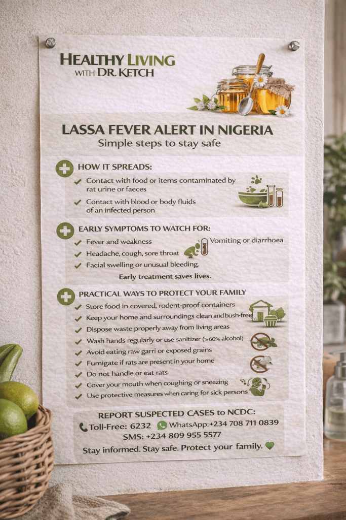 The Nigeria Centre for Disease Control can be contacted: Toll Free on: 6232; Whatsapp on: +234 708 711 0839; SMS on: +234 809 955 5577 to report any suspected case of Lassa Fever.